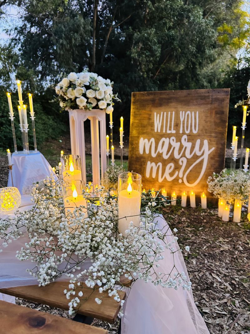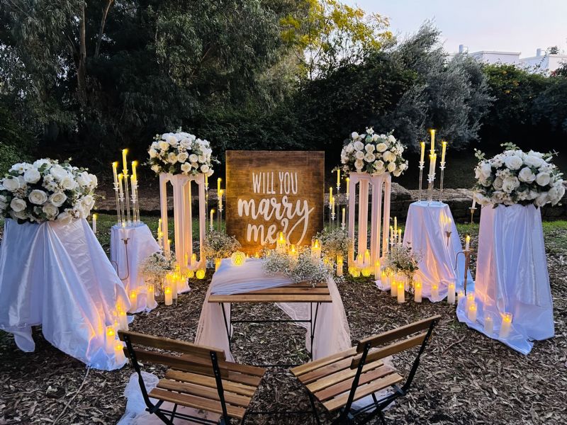 החבילה כוללת עיצוב אלגנטי בגווני לבן וזהב: עמודים מעוטרים בפרחים לבנים, שלט עץ “Will You Marry Me”, עשרות נרות לד, שולחן זוגי מעוצב ובקבוק יין מבעבע. העיצוב יוצר אווירה מהודרת ורגשית, מתאימה להצעות נישואין ולחגיגות רומנטיות מיוחדות. מלווה בצילום וידאו ותמונות למזכרת מהיום הכי חשוב שלכם.