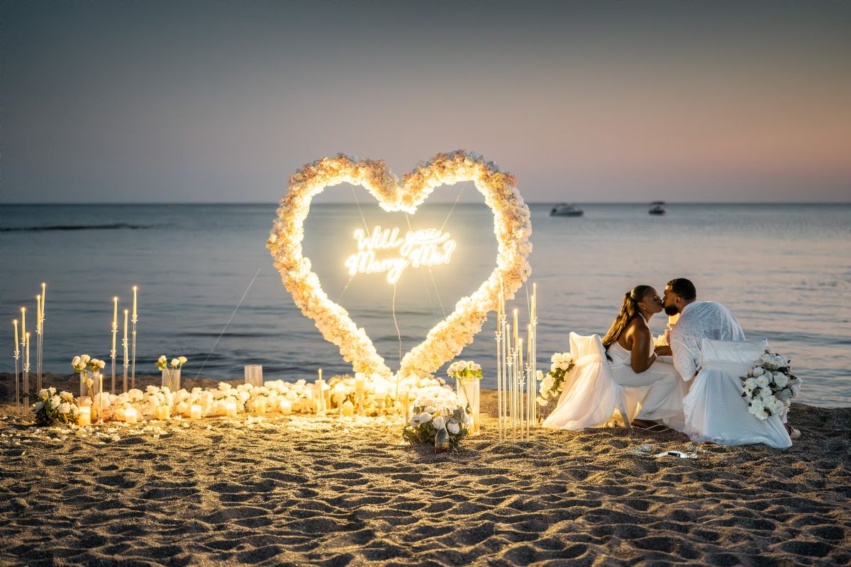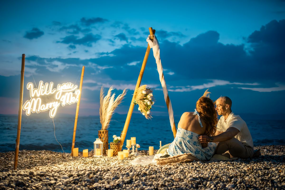 Looking for a truly unforgettable proposal idea in Rhodes? Imagine popping the question on a quiet beach at sunset, with glowing “MARRY ME” letters lighting up the shoreline. This stunning setup creates the perfect atmosphere for a heartfelt moment – intimate, romantic, and picture-perfect. With candlelight, champagne, and the Aegean Sea as your backdrop, this is one of the most unique and luxurious proposal ideas in Rhodes.