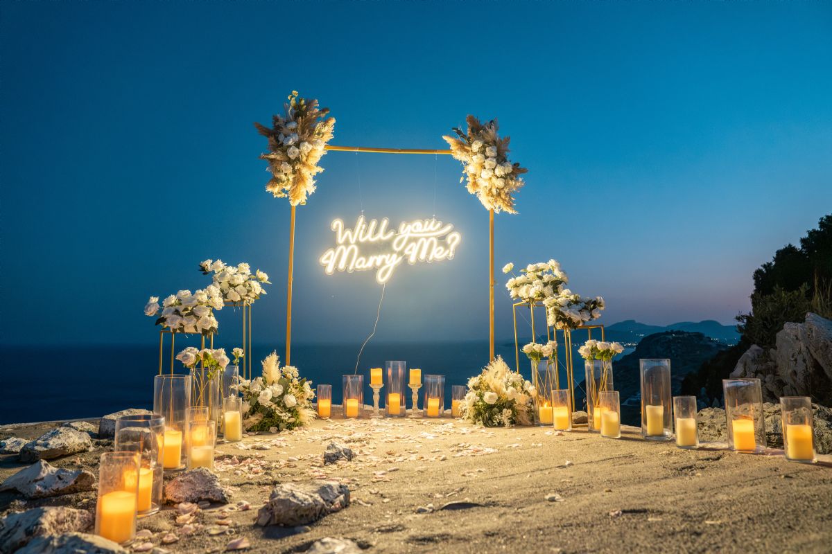 This stunning proposal scene is set against the natural beauty of Rhodes’ dramatic coastline. A grand heart-shaped floral arch made of delicate white and blush roses frames the moment perfectly, with a glowing “Will You Marry Me?” sign at its centre — impossible to miss, unforgettable to experience.